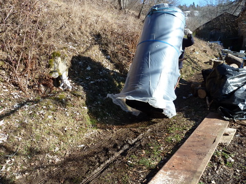Pour le coucher j'ai utilisé un portique balançoire et un mini palan que j'avais sous la main, puis des morceaux de tube pour le déplacer horizontalement, enfin redresser en accrochant le palan à une poutre de charpente. Pour le 2200l ça m'a pris une bonne journée.