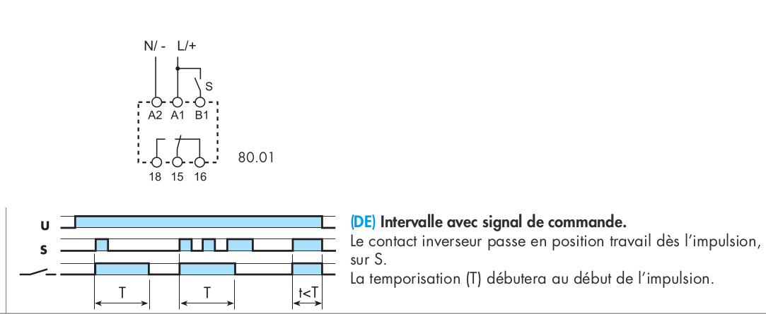 Le principe est le suivant: La bobine étant sous tension, le poussoir envoi une phase sur B1, et le contact se ferme le temps de la temporisation choisi.