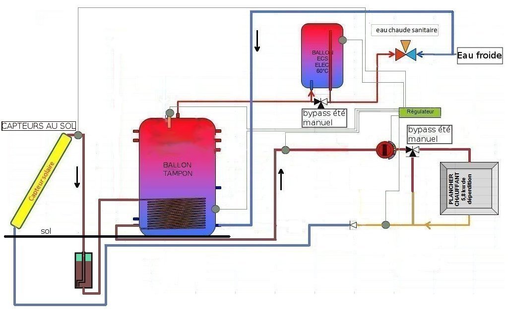 je sens que je vais être lourd, ... mais sur le schéma, comment le solaire chauffe-t-il le plancher chauffant ?