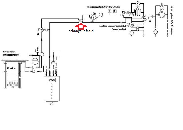 Je suis entrain de refaire l’installation de ma PAC vitocal 300 eau/eau et je me pose une question sur le branchement de l'échangeur pour le rafraîchissement sur mon ancienne installation l'eau du puits traverse l'échangeur intermédiaire et refroidi l'antigel ensuite l'antigel part vers la PAC ou via une vanne 3V a l'échangeur froid pourquoi ne pas relié directement l'échangeur froid en série a l'autre échangeur pour qu'il soit traversé par l'eau du puits plutôt que par l'antigel car du coup en position refroidissement j'ai un circulateur en plus qui tourne et une perte avec 2 échangeurs plutôt qu'un