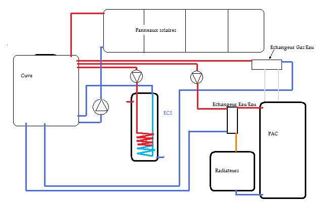 J'ai oublié de mettre dans mon schéma la chaudière à fioul; elle prendra le relais quand il n'y à plus de calorie dans la cuve.