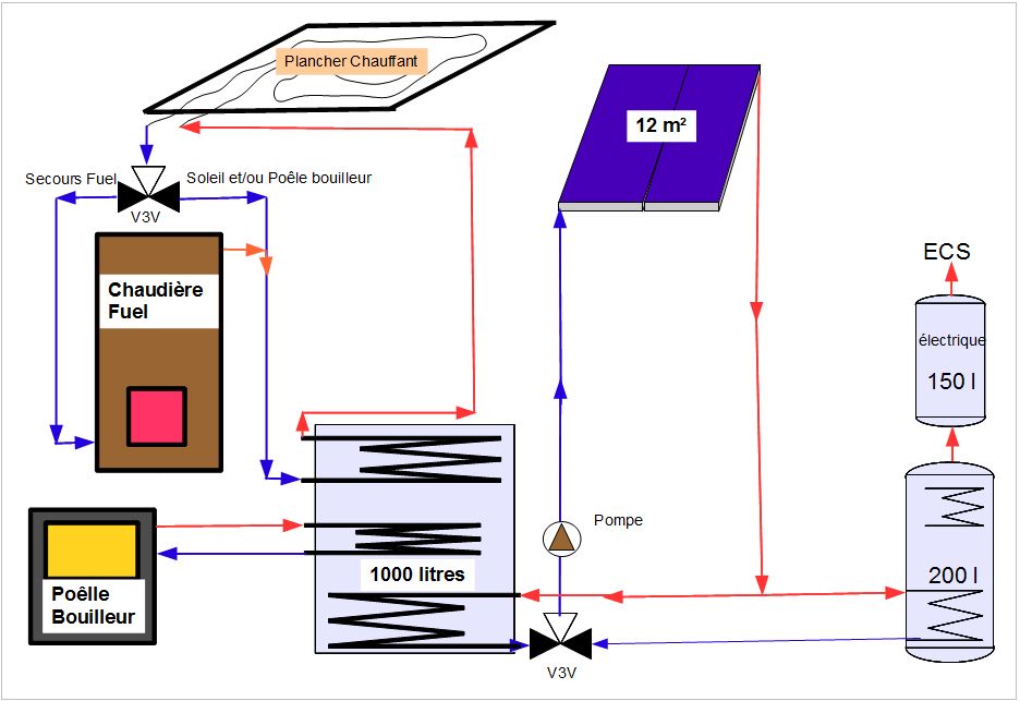 Ma chaudière fioul n'assure donc que le chauffage. Dans le cas d'une installation bois-solaire, elle ne sera là que pour assurer le secours en cas de manque de degrés dans la cuve de 1000 litres. Je ne veux donc pas qu'elle reste en permanence chaude (pertes par balayage de la chaudière). D'où la présence d'un V3V qui ne fera passer le retour chauffage dans la chaudière que lorsque la température du haut de la cuve ne sera pas suffisante.