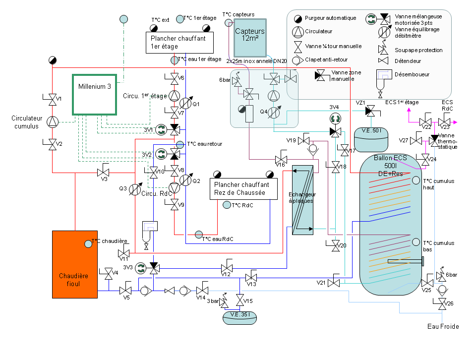 L'installation solaire (chauffage et CESI) telle qu'envisagée est la pose sur le toit de 12 m² de panneaux (trop de masques dans le jardin et liaison très longue) et l'utilisation d'un échangeur à plaque pour séparer les circuits solaire et planchers chauffants (Plancher Solaire pseudo-Direct !!). Le ballon ECS est chauffé par l'échangeur inférieure solaire et par l'appoint fioul (existant). Le tout est géré par l'automate M3 et supervisé par "Smartapp"