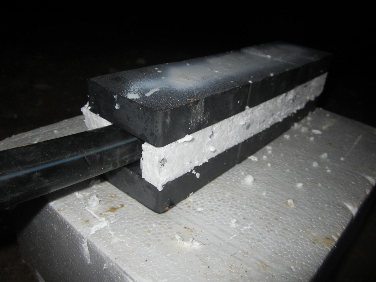 Voulant tester l'efficacité de la chose dans un premier temps, je me suis contenté de faire passer la canalisation entre les aimants maintenus simplement de part et d'autre du tuyau par une épaisseur de polystyrène de l'épaisseur de la canalisation, le tout posé sur la caissette en polystyrène utilisée pour me livrer les aimants.