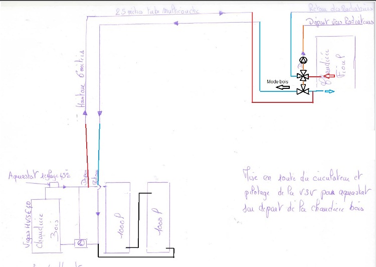 Pour répondre à Did88 je constate une anomalie sur le schéma présenté, la sonde de température (aquastat réglé à 45°C se trouve sur le départ de la chaudière bois . Elle n'est pas au bon emplacement Elle doit se situer entre la vanne 3 voies mélangeuses et le circulateur pour piloter cette vanne .