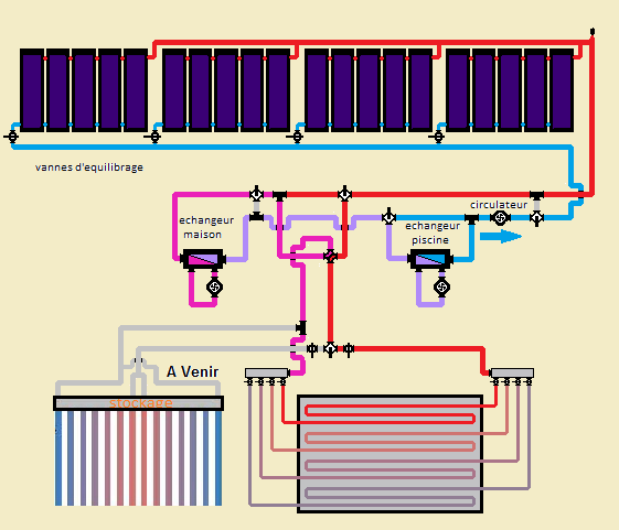 je suis en finalisation (programmation du M3 réalisation de stockages + plomberie a peaufiner !) d'une auto installation de 40 m2 de panneaux plats au sol pour le chauffage direct de la maison avec un échangeur inox 50 plaques de 550Kw max et piscine avec 2 échangeurs titane 70kw