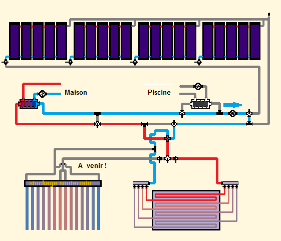 je suis en finalisation (programmation du M3 réalisation de stockages + plomberie a peaufiner !) d'une auto installation de 40 m2 de panneaux plats au sol pour le chauffage direct de la maison avec un échangeur inox 50 plaques de 550Kw max et piscine avec 2 échangeurs titane 70kw