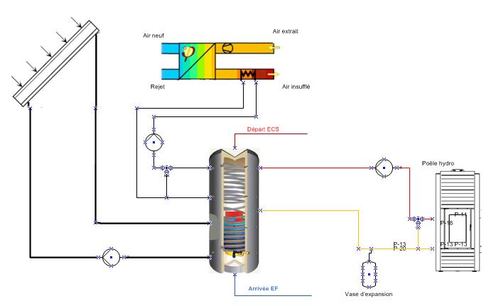 Le ballon aura donc uniquement un serpentin solaire en bas et un serpentin ECS instantanée. Le poêle bouilleur (puissance de chauffage de l'air à définir avec le thermicien) sera connecté en directe sur le ballon, et les 2 sèches serviettes des salles de bain + les 2 batteries "eau chaude" de la VMC prélèveront l'eau chaude en haut du ballon, avec retour en bas). La batterie "eau froide" sera connectée sur l'arrivée d'ECS, avant qu'elle ne passe dans le serpentin "ECS instantanée" du ballon.