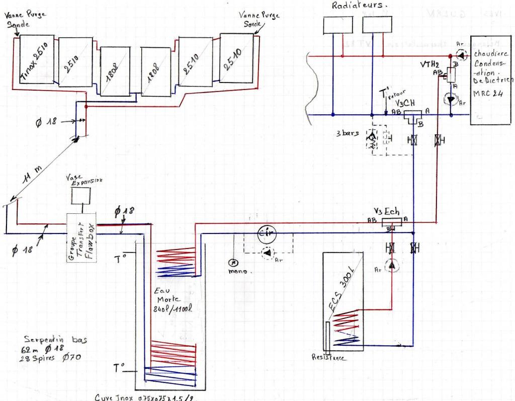 A l'origine j'avais prévu une cuve ouverte avec 2 échangeurs. Les conseils étaient de supprimer un échangeur et l'on me préconisait " une légère pression dans la cuve" pour prendre l'eau du chauffage;je n'avais pas compris