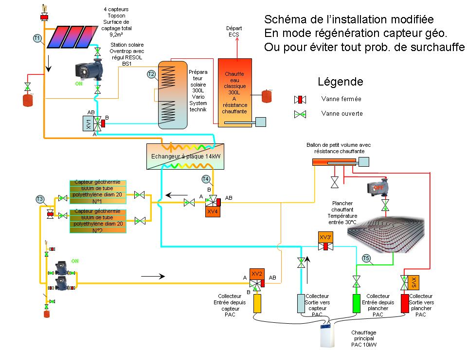 j'apprends et fait des erreurs. Je ne connaissait pas se site. Donc mon idée première était de stocker de l'eau à température maximum dans mon préparateur. J'ai monté un thermostat dans la partie 1/3 de mon ballon préparateur. Ce thermostat pilote le basculement de la vanne 3 voies XV1 (Voir schéma de mon installation actuelle (pas celle dessiné ci dessous qui est envisagée)) Ce thermostat est actuelement réglé à 60°C. Ce qui veut dire que la température du ballon doit avoir atteint 60°C au 1/3 tier du ballon pour que enfin je bascule vers le réseau géothermique. Donc 60°C au 1/3 correspondent chez moi à presque 100°C au niveau haut du ballon préparateur. C'est une erreur, je sais maintenant que cela n'est pas très bon.