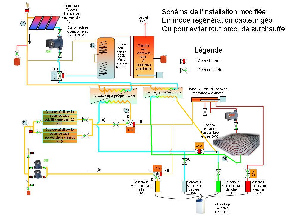 j'apprends et fait des erreurs. Je ne connaissait pas se site. Donc mon idée première était de stocker de l'eau à température maximum dans mon préparateur. J'ai monté un thermostat dans la partie 1/3 de mon ballon préparateur. Ce thermostat pilote le basculement de la vanne 3 voies XV1 (Voir schéma de mon installation actuelle (pas celle dessiné ci dessous qui est envisagée)) Ce thermostat est actuelement réglé à 60°C. Ce qui veut dire que la température du ballon doit avoir atteint 60°C au 1/3 tier du ballon pour que enfin je bascule vers le réseau géothermique. Donc 60°C au 1/3 correspondent chez moi à presque 100°C au niveau haut du ballon préparateur. C'est une erreur, je sais maintenant que cela n'est pas très bon.