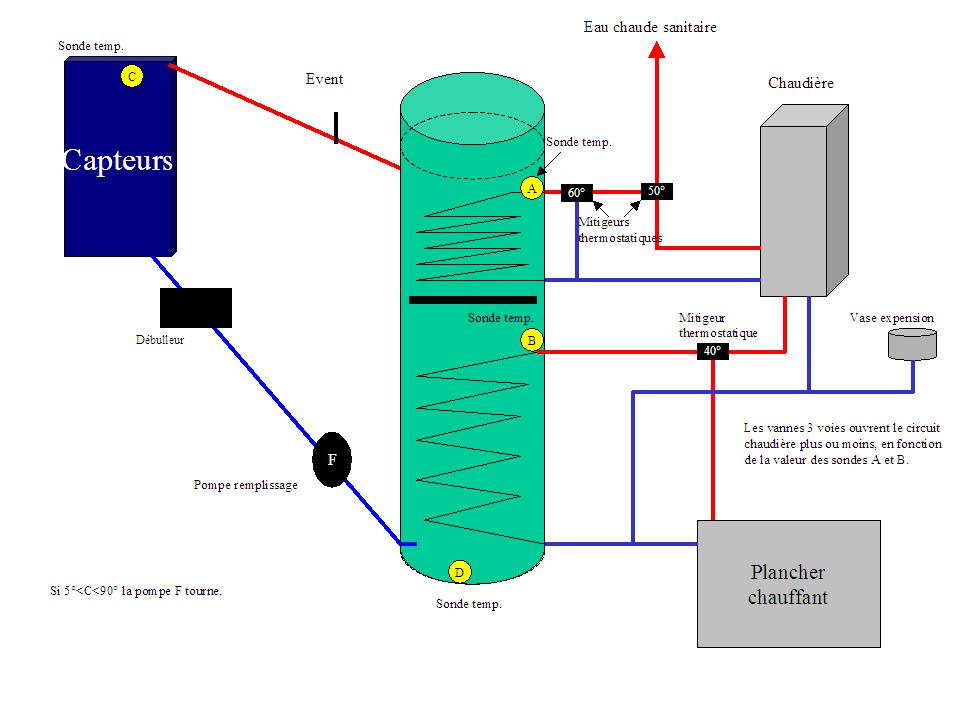 En effet, tu as bien besoin de C et D pour définir un delta d'mise en route ou arret circu..., d'un autre coté, la sonde A te sert toujours pour un maxi autorisé avant "cocote minute"( c'est en haut l'plus chaud normalement :roll: ). Si tu attend 80° en bas....tu devrais les avoir en été avec 45° d'inclinaison ( moins en 1/2 saison quoi qu'dans ton coin!!!!), mais si par chance ça stratifie bien....combien t'aurra en haut ?