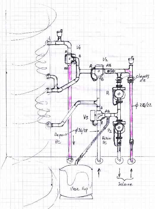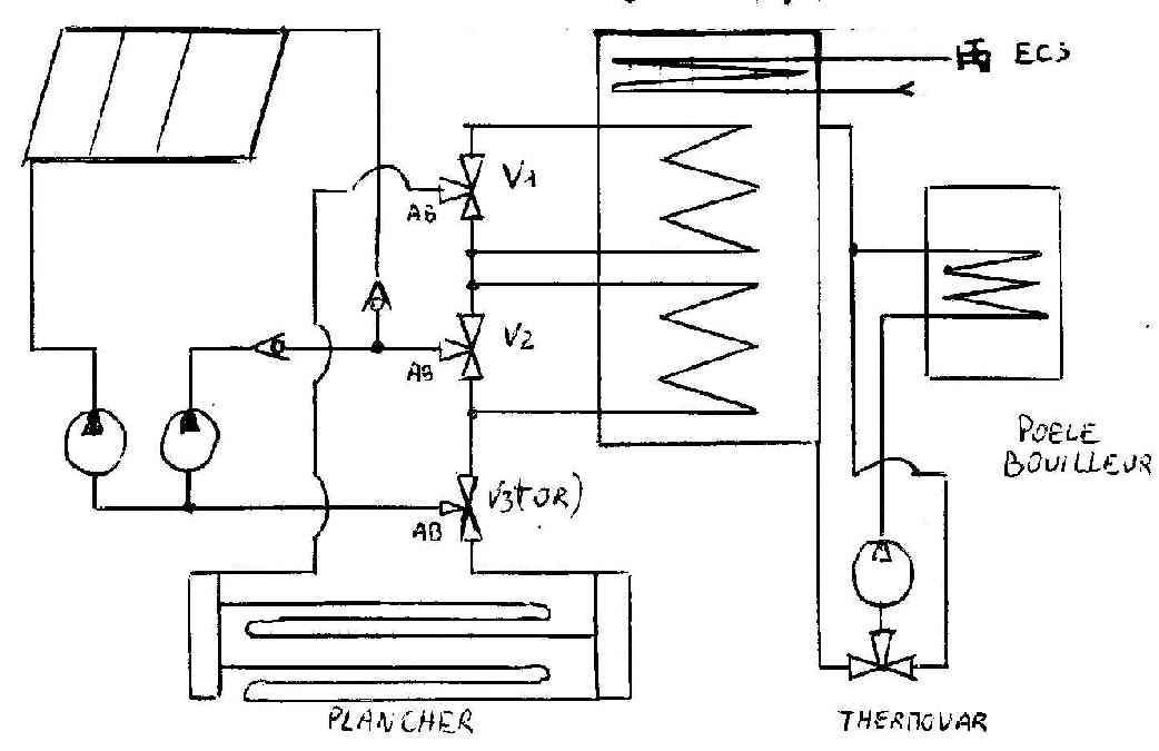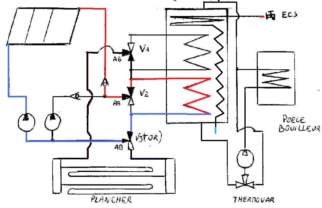 Le schéma permettrai que le solaire soit utilisé en permanence soit en couverture totale ou en préchauffage.