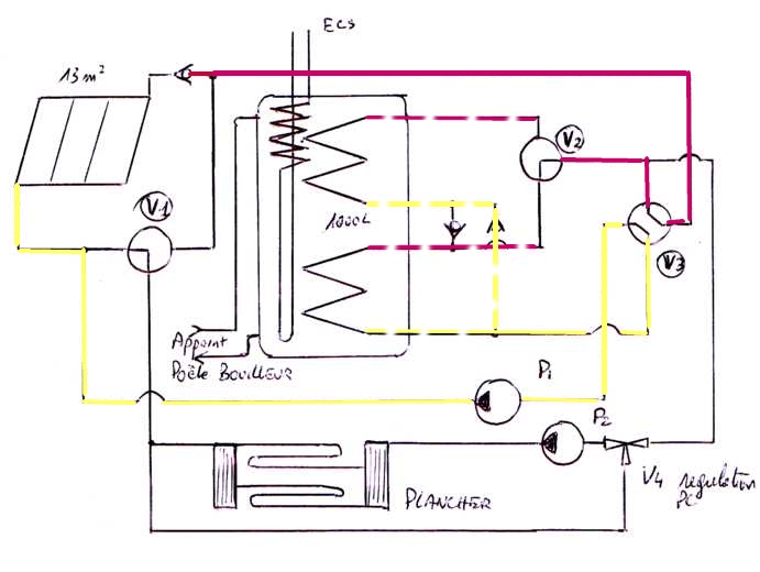 Dans mon cas, la chape de PC ne fait que 12cm (moins d'inertie) donc stockage dans ballon obligatoire.