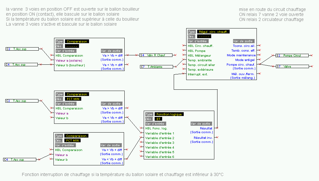 en finalisant ce petit exemple, je devrais arriver à faire le reste. mon problème, c'est que normalement, la vanne 3 voies du choix du ballon solaire ou bouilleur ne devrait être choisie (donc en fonction) que si il y a une demande de chauffage (via le thermostat)