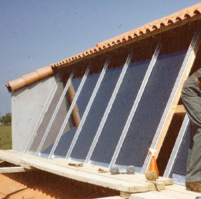 Mes "vieux" capteurs Martelsun respirent et condensent, mais ça s'évacue dès les premiers réchauffements (photos jointes). Une feuille d'alu est placée derrière les absorbeurs. Le fond du panneau est en contreplaqué de 10 mm, et l'isolant est de la laine de verre sur l'épaisseur chevron + panne (environ 25 cm).