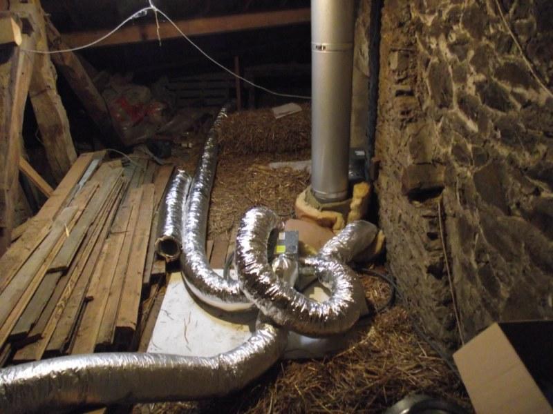 Rien de compliqué, une gaine puise l'air chaud dans la double coque de l'insert et la turbine de 500 m3/h envoie ça aux quatre coins de la maison.