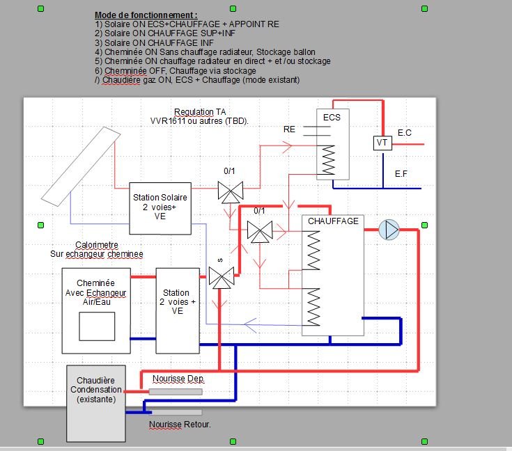 Voila le schéma préliminaire. C'est un schéma fonctionnel, il n'y a pas d'antiretour vannes d'arret, capteur de temperatures ...