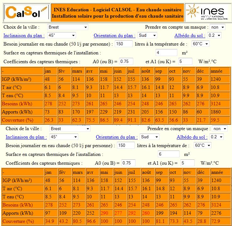 Fanch a pris comme exemple: le kit habituel" posé en bretagne (300L - 2 panneaux à 45°), donc j'ai "supposé" 4m² et un besoin 150l par jour