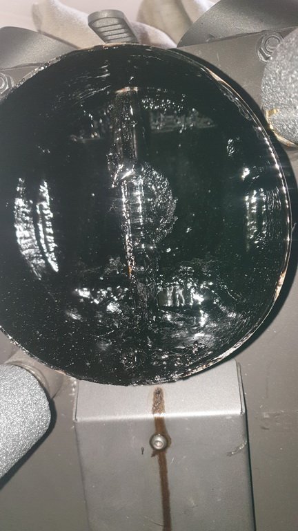 J'ai démonté le conduit hier et après 3 semaines d'utilisation voilà la tête du conduit : Je pourrais refaire mon allée avec tout ce goudron !!!