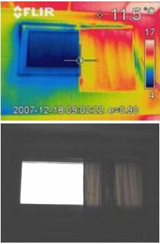 Les alliages de métaux que l'on vise donne des résultats très différents (cuivre, laiton, acier). Je colle un adhésif noir sur toutes les surfaces que je dois mesurer et les mesures sont cohérentes. Gilles[/quote]Même réponse pour moi aussi. Un constat : température de la surface intérieure d'un vitrage qui donne une sensation de froid. La température du rideau tiré devant supprime cette sensation. On peut mesurer l'écart avec ce type de thermomètre, mais la thermographie le met en évidence(voir image jointe).