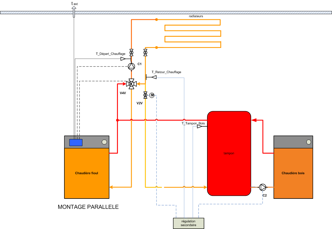 - la sortie tampon alimente la V4V en parallèle de la chaudière fioul, la régulation fonctionne normalement