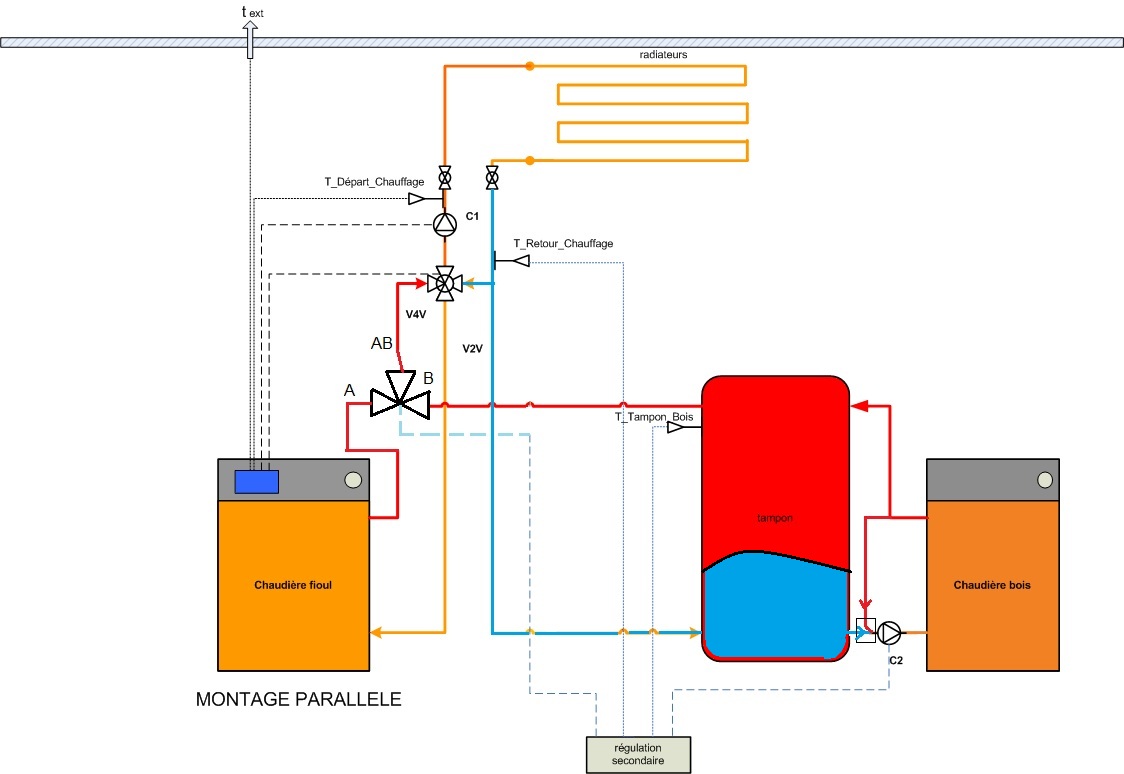 On devrait pouvoir faire du parallèle sans ajouter une nouvelle régulation a condition de pouvoir repiquer entre le départ chaudière et l'entrée V4V; est ce possible ?