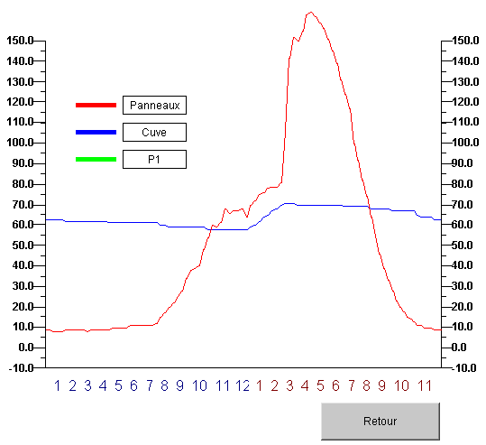 Sur le diagramme d'aujourd'hui, on voit clairement que lorsque la consigne de 70°C est atteinte vers ~3h, le circuit solaire se vide (drain back) et les panneaux pleins d'air montent allègrement à 170°C. Ce 'gaspillage' sera exploité dès que la piscine sera remise en eau vers mi-juin.