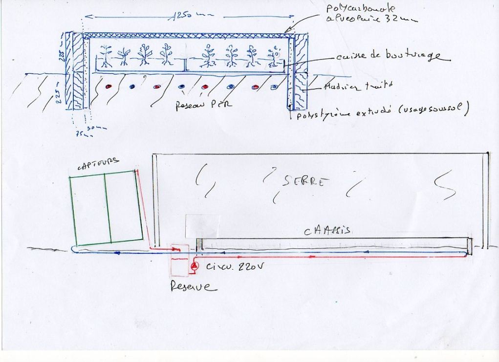 Sans aucunement être en concurence avec l'expé de Pierre dans le 04 ( que je suis avec grand intérêt ) je vous soumet ce soir un projet de chauffage solaire de chassis de bouturage que je suis chargé de réaliser, bénévolement évidemment, chez un ami pépinériste dans le haut var, spécialisé dans les plantes adaptées à notre climat : pas d'arrossage et rustique : -10/-15°).
