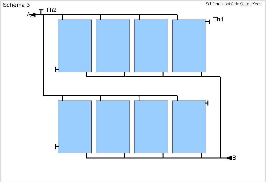 Quelques questions concernant le raccordement des panneaux. Dans les trois schémas, il me semble que je suis bien en Tickelman puisque le fluide parcourt la même distance entre le point A et le point B.