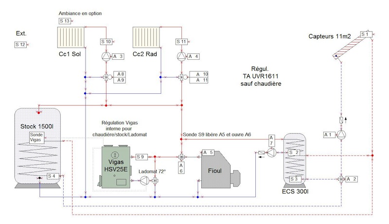 N'est il pas plus simple, mais c'est peut etre ce que tu as representé, que la sortie du ballon se connecte sur le ligne de sortie de la chaudiere et donc tu utilises la meme V3V, je ne sais pas si je suis clair ... En gros voir le schema de Keke !