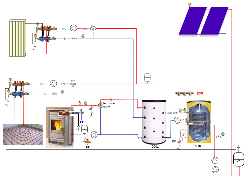 Sachant qu'il y a une bonne longueur entre ballon et capteurs (le ballon est dans le local technique qui sert d'espace tampon au nord et les panneaux au Sud sur le toit), ça me simplifie aussi le circuit entre les capteurs et le ballon car je peux descendre tout droit jusque dans le VS et je peux revenir au ballon par le VS.
